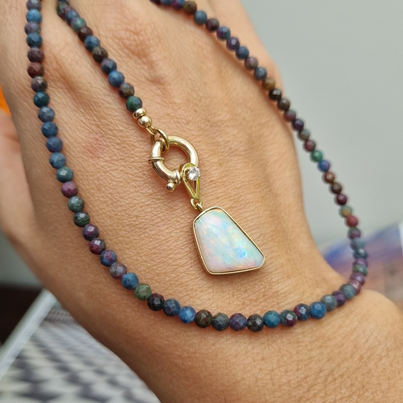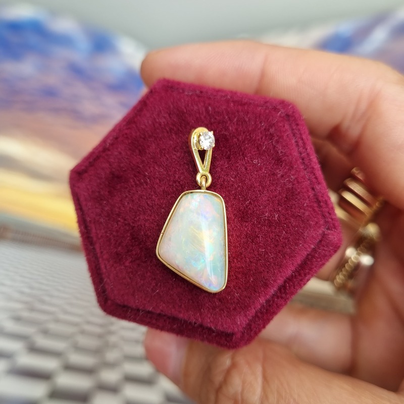 Asteria is een 14 karaat geelgouden bedel met een sprankelende opaal en een 0.10ct diamant. Een charmant sieraad dat luxe en speelse elegantie combineert.