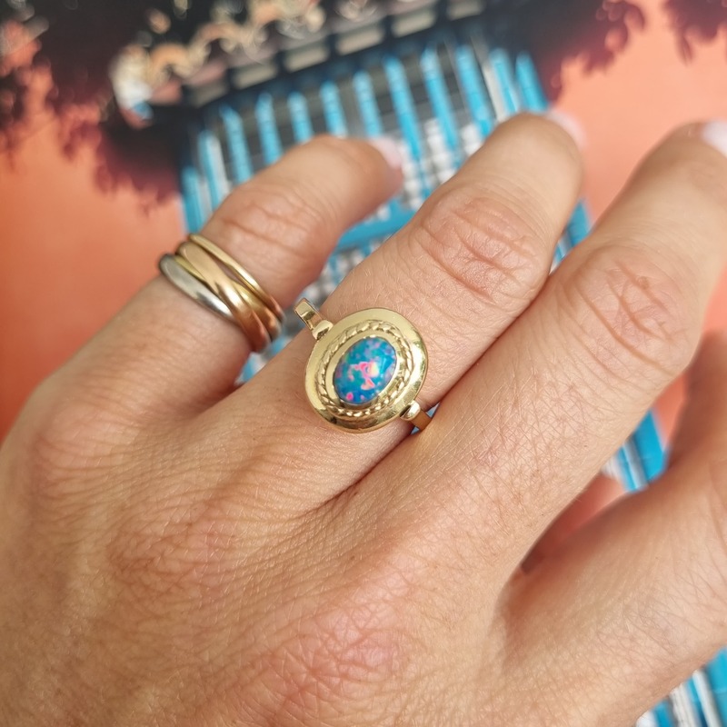 Exclusieve 14 karaat geelgouden ring met een ovale Australische opaal. De levendige kleurspeling van de opaal maakt dit sieraad uniek en betoverend – een elegante eyecatcher met natuurlijke charme.