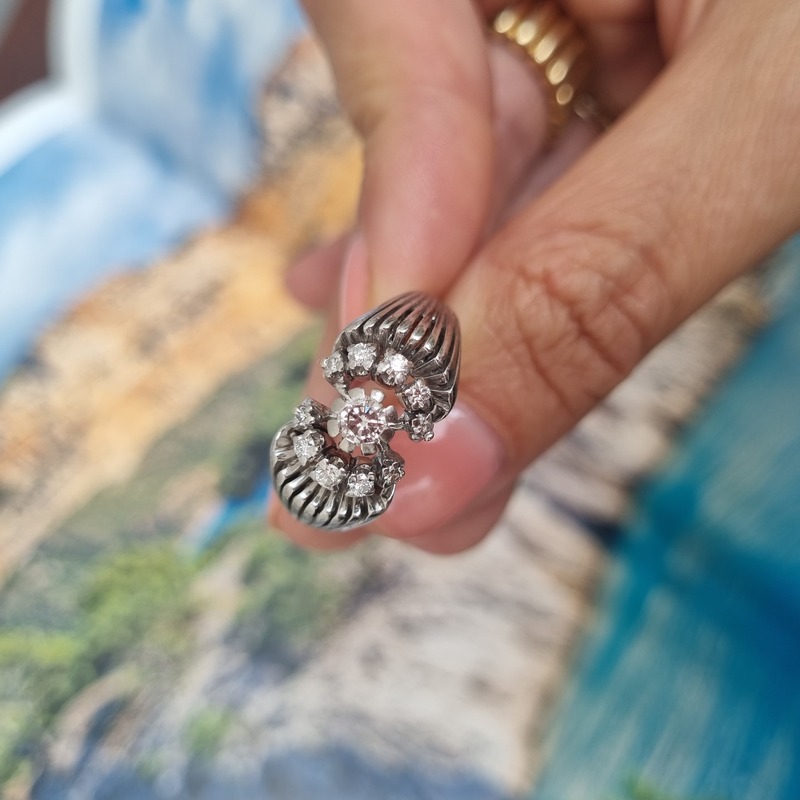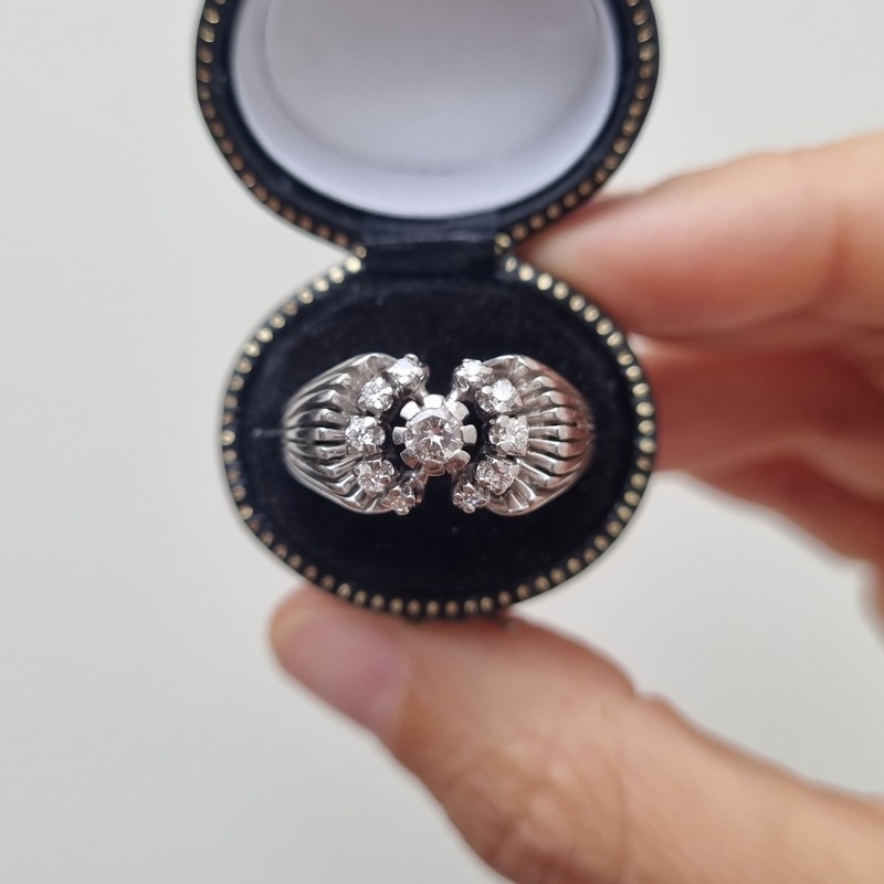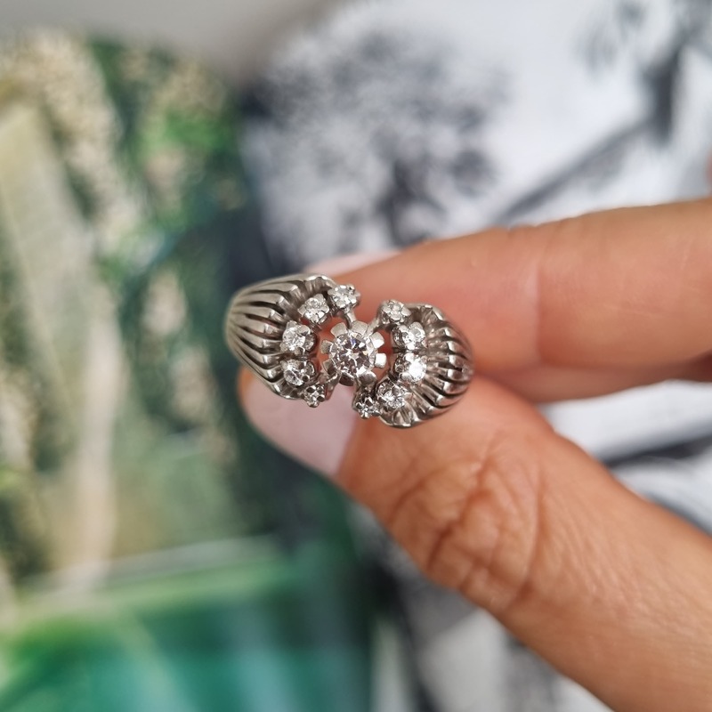Mari is een ring met maar liefst elf diamanten. Wat de ring zo bijzonder maakt is dat je ernaar wilt blijven kijken. Vanaf de zijkant is hij minstens zo mooi. De waanzinnige diamant die centraal staat met de tien diamanten eromheen hebben een totaal van zo’n 0.3ct. De ring is 14 karaat witgoud.