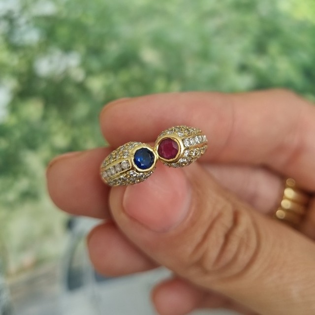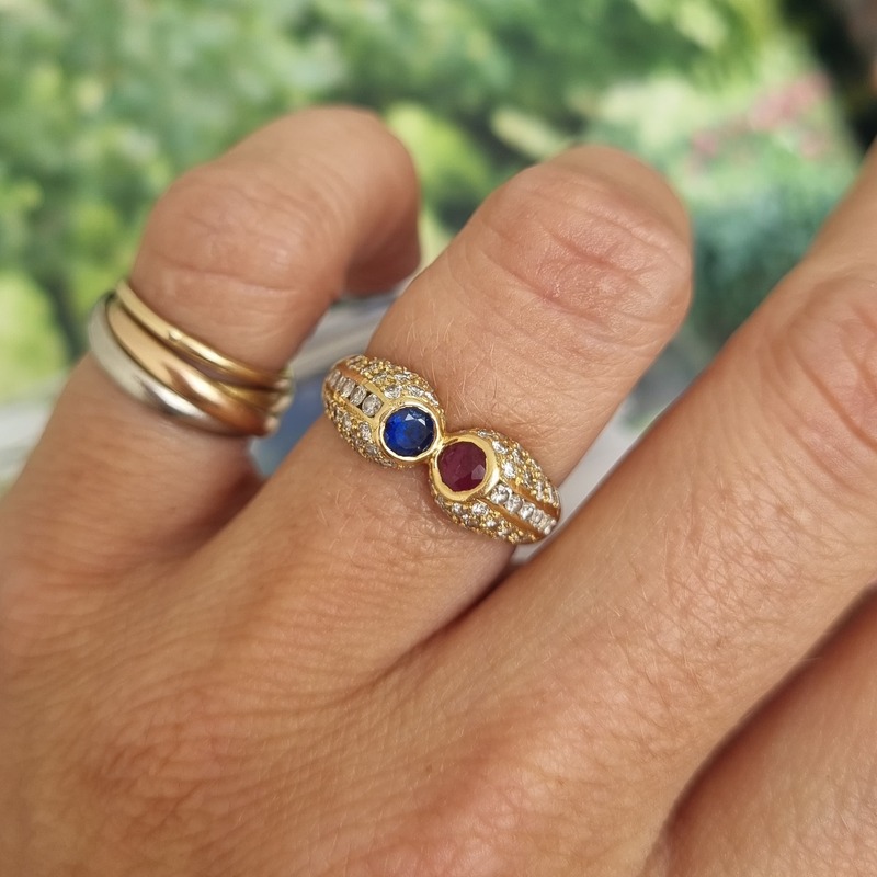Massimo, Een bijzondere 18 karaat geelgouden ring met saffier, robijn en maar liefst 64 diamanten van 0.01ct.