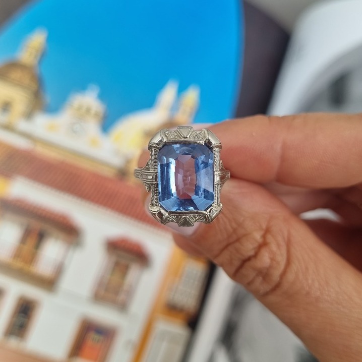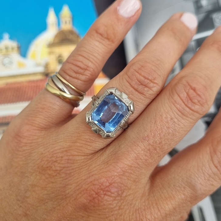 Mucha is een 18 karaat witgouden ring in Art Deco-stijl met een levendige blauwe topaas als middelpunt. Het geometrische ontwerp geeft deze uitgesproken ring een elegante uitstraling.