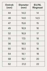- Bekijk het overzicht hieronder welke omtrek communiceert met welke ringmaat.